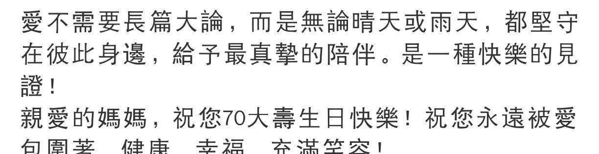 林俊杰在配文中写道:“親愛的媽媽,祝您70大壽生日快樂!祝您永遠被愛包圍著、健康、幸福、充滿笑容! 。”,这句话似乎既是对母亲生日的祝福。